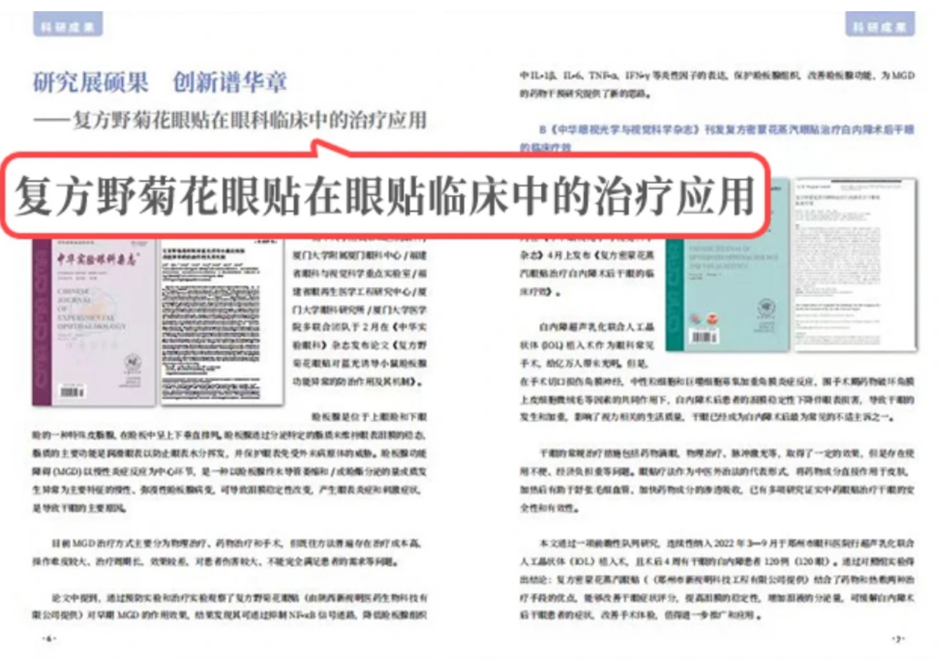 多項研究成果以文章的形式發(fā)布于各大醫(yī)學(xué)雜志。其中《復(fù)方野菊花眼貼在治療輕中度干眼的臨床價值》刊登于《中華眼科雜志》。