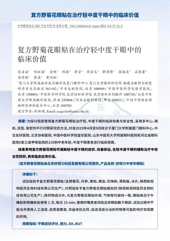 《中華眼科雜志》重點(diǎn)發(fā)布的“復(fù)方野菊花眼貼在治療輕中度干眼中的臨床價(jià)值”,對(duì)干眼治療方向有著重大參考意義。