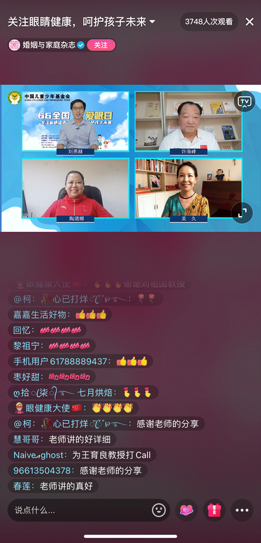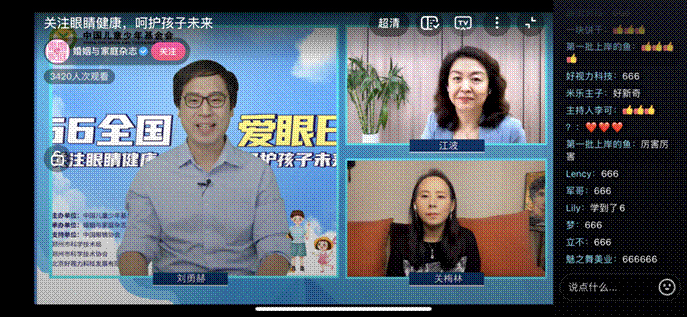 中國兒童少年基金會秘書長張彥紅、知名眼科專家、體育界代表、教育專家等齊聚@婚姻與家庭雜志直播間,聯(lián)合本次活動主持人劉勇赫,共同圍繞兒童青少年近視防控、干眼、愛眼護(hù)眼知識、戶外運動、兒童健康行為管理等內(nèi)容進(jìn)行眼健康科普,內(nèi)容豐富,彈幕區(qū)好評如潮。