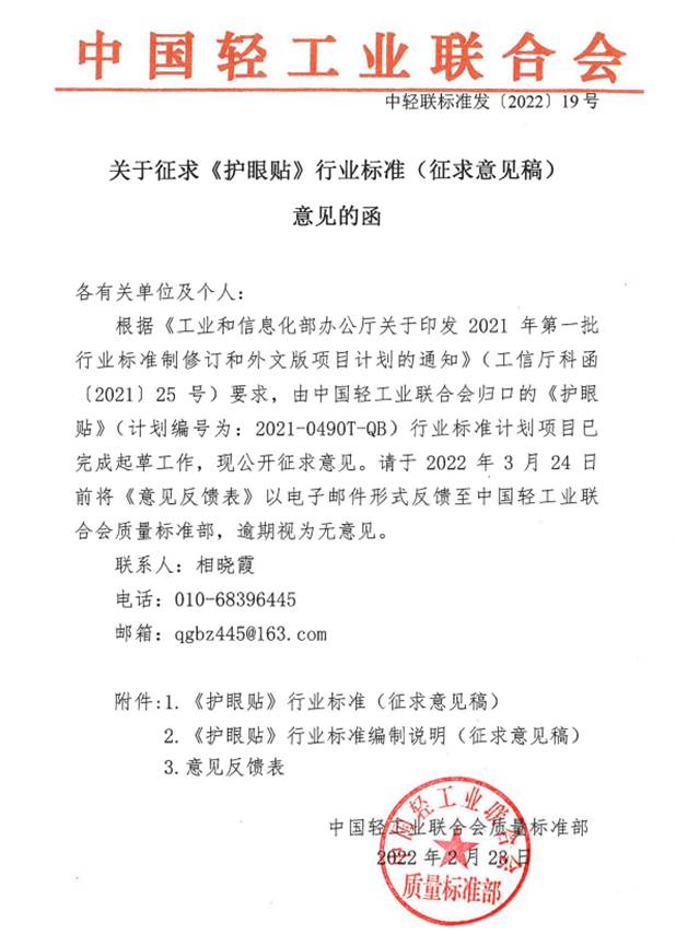 2021年2月,鄭州市新視明科技工程有限公司、北京好視力科技發(fā)展有限公司、陜西新視明醫(yī)藥生物科技有限公司、譜尼測試集團(tuán)股份有限公司、河南省產(chǎn)品質(zhì)量監(jiān)督檢驗院、云南白藥集團(tuán)股份有限公司、江西珍視明藥業(yè)有限責(zé)任公司聯(lián)合起草、并歸口于中國輕工業(yè)聯(lián)合會的《護(hù)眼貼》行業(yè)標(biāo)準(zhǔn)完成立項工作,并于2022年2~3月完成意見征集工作。該標(biāo)準(zhǔn)規(guī)定了護(hù)眼貼的術(shù)語和定義、要求、試驗方法、檢驗規(guī)則、標(biāo)簽、標(biāo)志與說明書、包裝、運輸、貯存及有效期,嚴(yán)格規(guī)范了護(hù)眼貼的生產(chǎn)與檢測條件,為規(guī)范護(hù)眼貼市場提供了重要的理論依據(jù)。