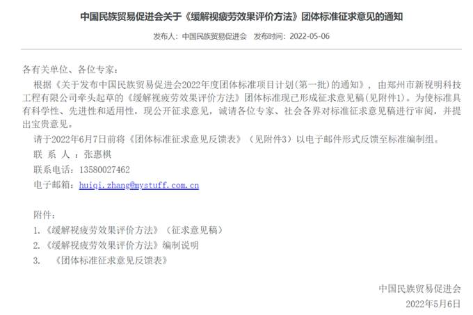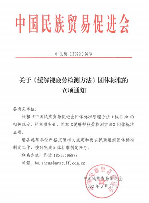 2022年3月,由鄭州市新視明科技工程有限公司、陜西新視明醫(yī)藥生物科技有限公司、北京好視力科技發(fā)展有限公司聯(lián)合起草、并歸口于中國民族貿(mào)易促進(jìn)會的《護(hù)眼產(chǎn)品緩解視疲勞效果評價方法》團(tuán)體標(biāo)準(zhǔn)完成立項工作,并于2022年5-6月完成意見征集。最終于2022年6月21日完成了標(biāo)準(zhǔn)的發(fā)布。該標(biāo)準(zhǔn)規(guī)定了護(hù)眼產(chǎn)品緩解視疲勞效果的總體要求、試驗流程、評價指標(biāo)、數(shù)據(jù)分析和結(jié)果判定的內(nèi)容,適用于研發(fā)、改進(jìn)或測試護(hù)眼產(chǎn)品緩解眼疲勞效果的機(jī)構(gòu)或組織,為護(hù)眼產(chǎn)品緩解視疲勞效果提供了理論評價依據(jù)。