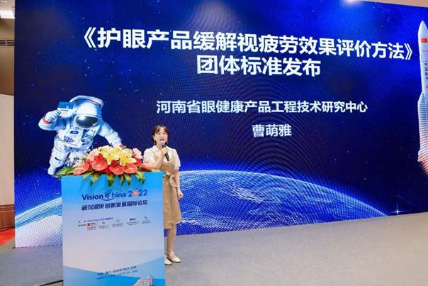 在7月23日上午的新聞發(fā)布會中,視覺健康領(lǐng)域新科研成果《護(hù)眼產(chǎn)品緩解視疲勞效果評價方法》團(tuán)體標(biāo)準(zhǔn)亮相Vision China 2022新聞發(fā)布會,河南省眼健康產(chǎn)品工程技術(shù)研究中心主任曹萌雅為大家做了科研成果匯報。