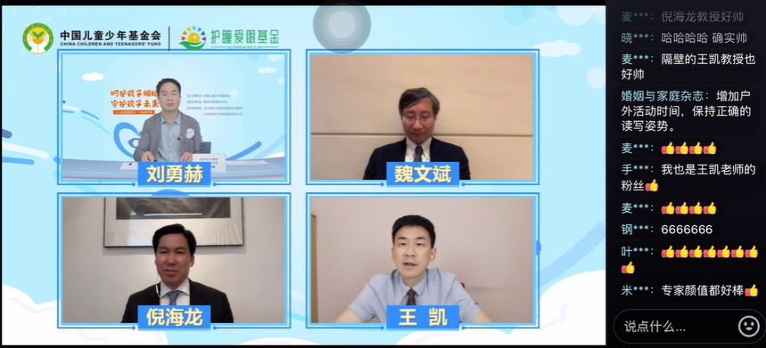 溫州醫(yī)科大學(xué)眼視光醫(yī)學(xué)部主任瞿佳、首都醫(yī)科大學(xué)附屬北京同仁醫(yī)院副院長(zhǎng)魏文斌、浙江大學(xué)附屬第二醫(yī)院眼科中心視光中心主任倪海龍、北京大學(xué)人民醫(yī)院眼視光中心主任醫(yī)師王凱,圍繞近視防控國(guó)家戰(zhàn)略、就兒童青少年近視防控問(wèn)題,養(yǎng)成良好用眼習(xí)慣等方面進(jìn)行科普。