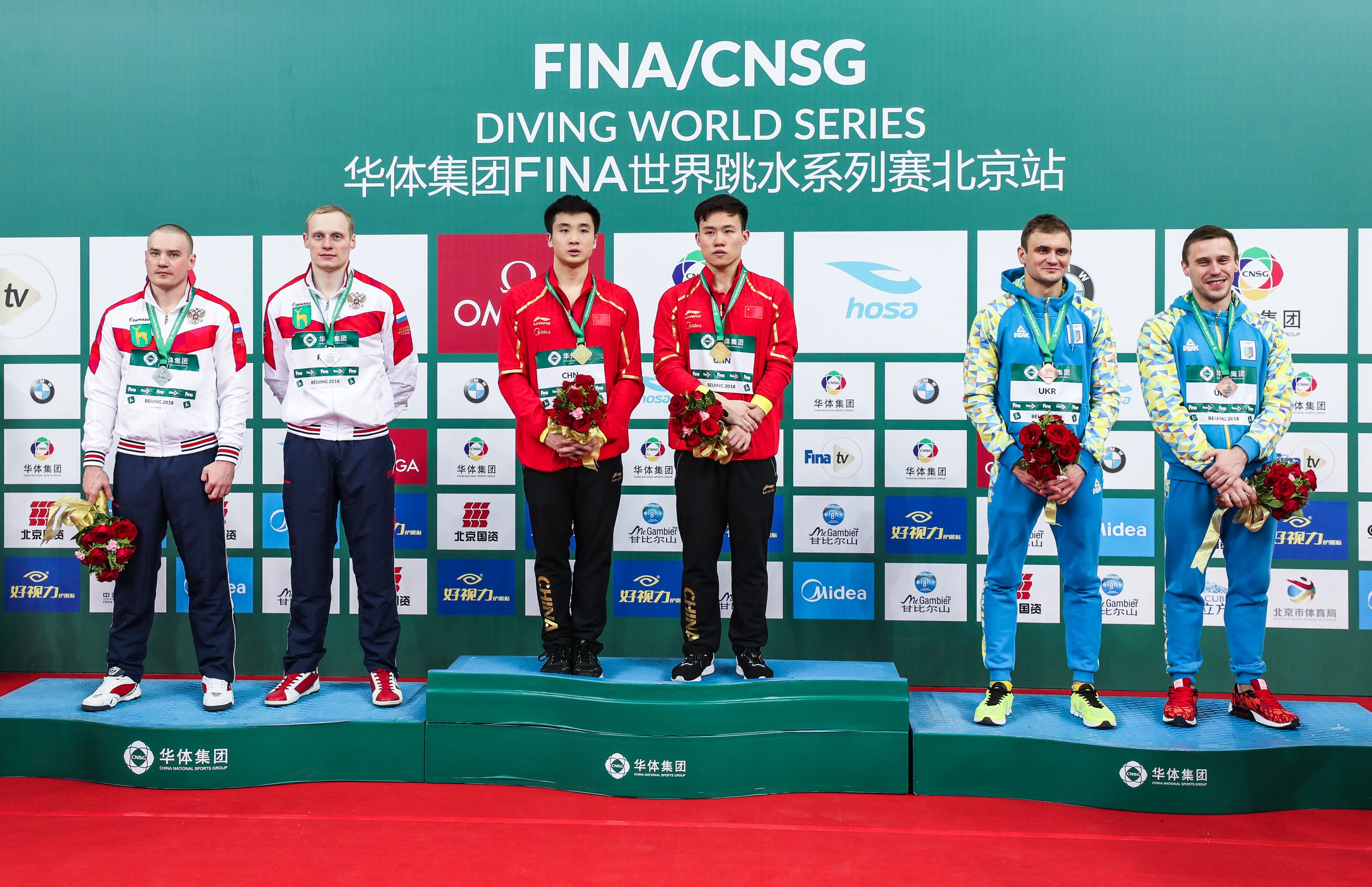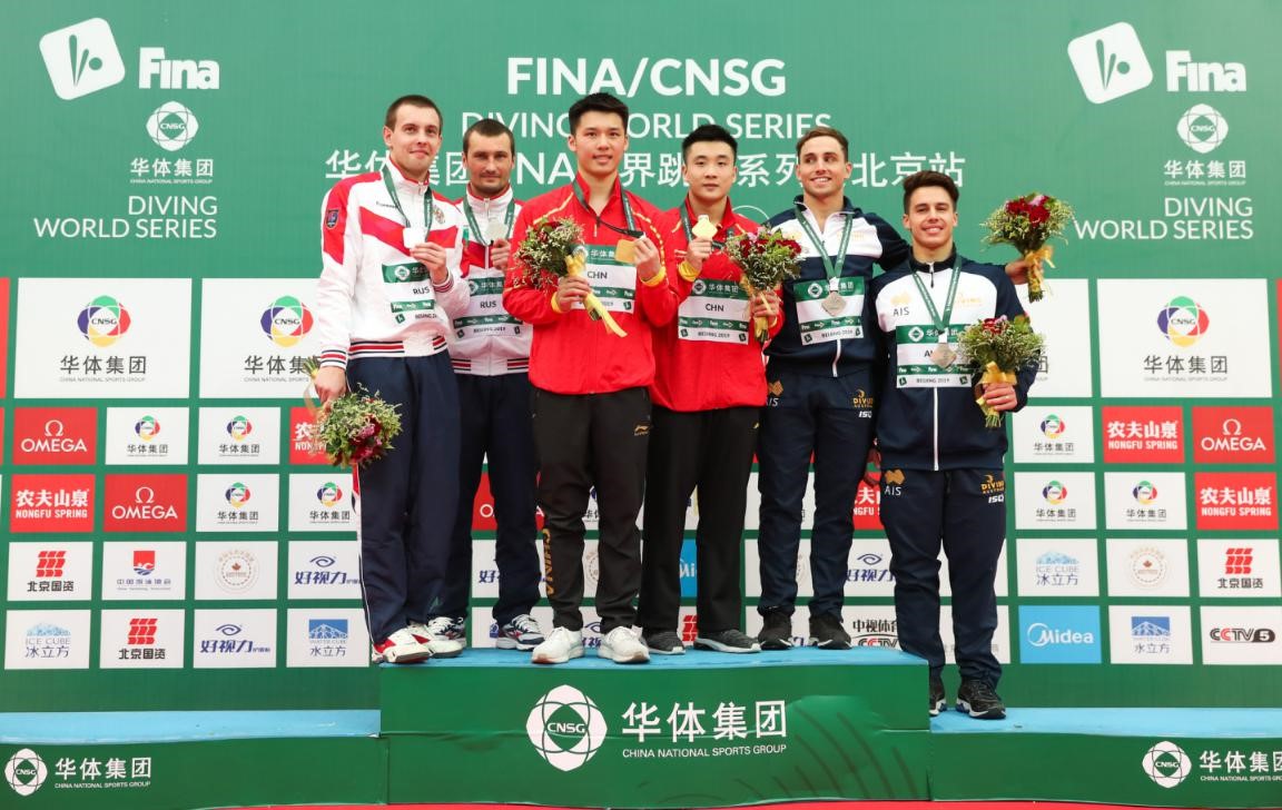 曹緣(右三)搭檔陳艾森奪得男子雙人10米臺冠軍