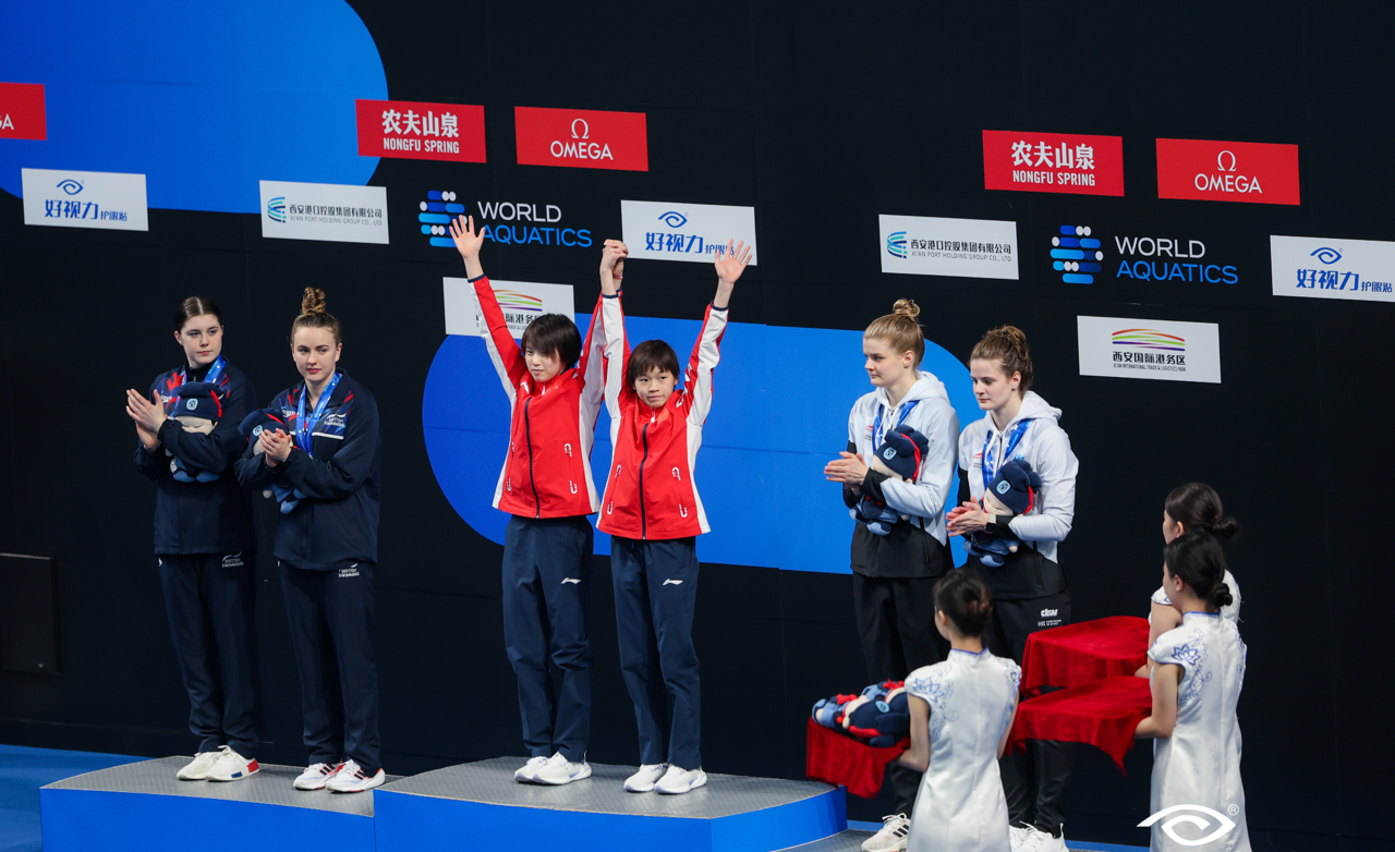 時隔三年,在2023年4月14日西安奧體中心舉辦的世界泳聯(lián)跳水世界杯西安站女子雙人10米臺決賽,中國組合全紅嬋、陳芋汐憑借出色的發(fā)揮,再次上演“水花消失術(shù)”;最終以總分373.20分獲得金牌,為中國跳水隊贏得開門紅!